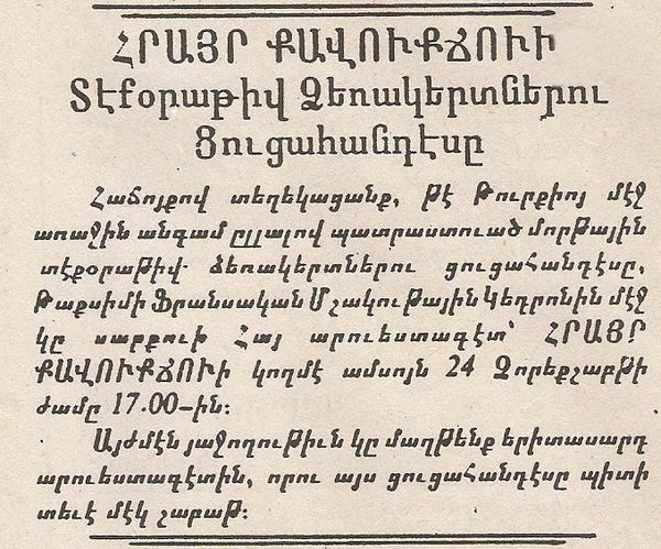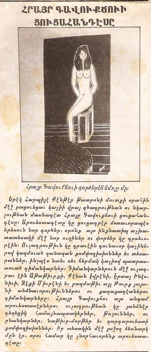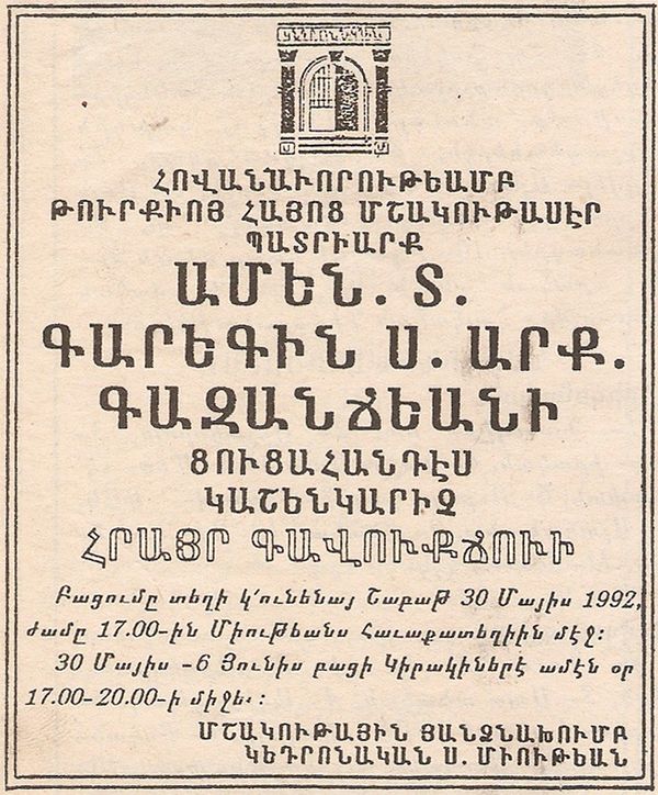 Until then, a couple of weeks before Hrayr successfully created the portrait of the Patriarch of Armenians of Turkey, Karekin Archbishop Kazancyan's, which was from his remarkable works. The artist has specious programs like he is planning to hold those solo exhibitions abroad, since foreigners, who are directly admiring his artworks while seeing, in a way they are trying to dictate to find a chance to show those artworks to the artist of abroad since they mentioned that these branches of art were tried a hundred years before and they become extinct, which is a very difficult and laborious craft.