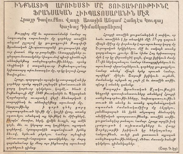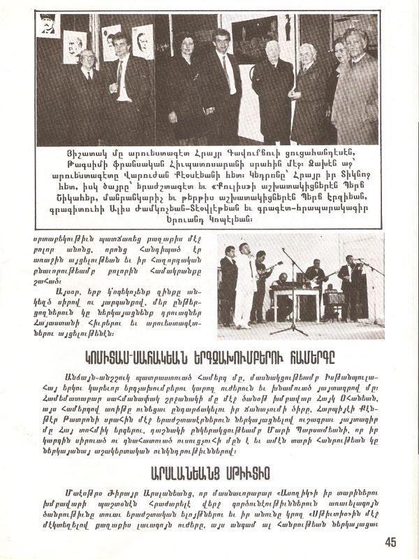 A memory from Hrayr Kavukcu's exhibition in Franch Cultural Center at Taksim: From left to right, the artist is with Varujan Koseyan: The middle, Hrayr with his wife, and on the corner, musician and "Kulis" magazine colleague Berc Chigaher, miniaturist and colleague from this newspaper Berc Erzian, literate Alis Jamgotsian-Deovletian and Literary-publicist Yervant Gobelian.