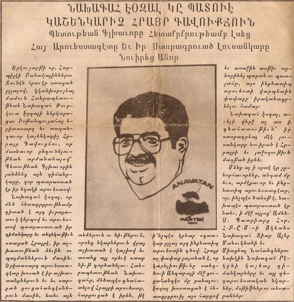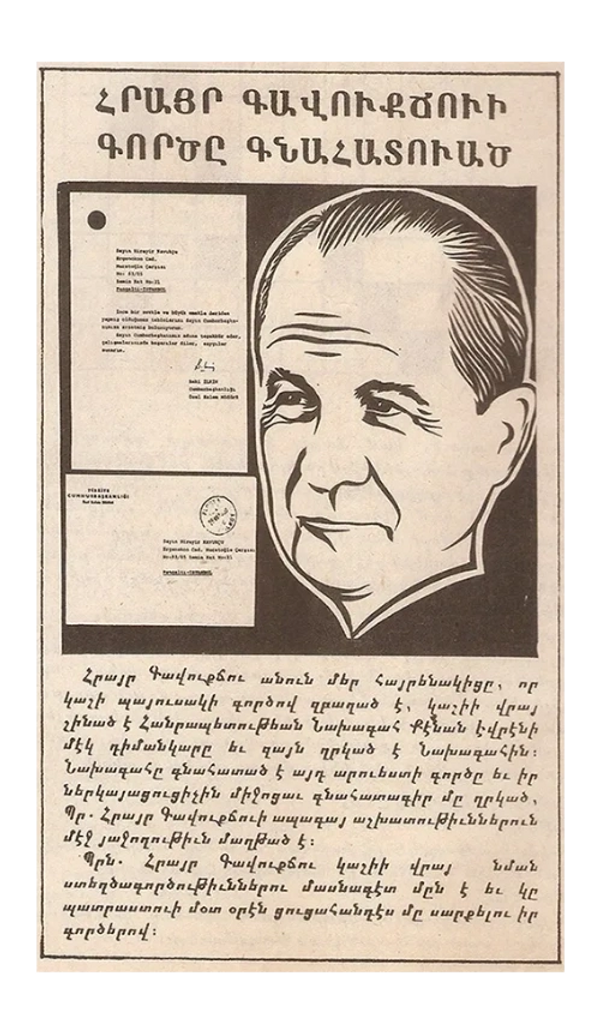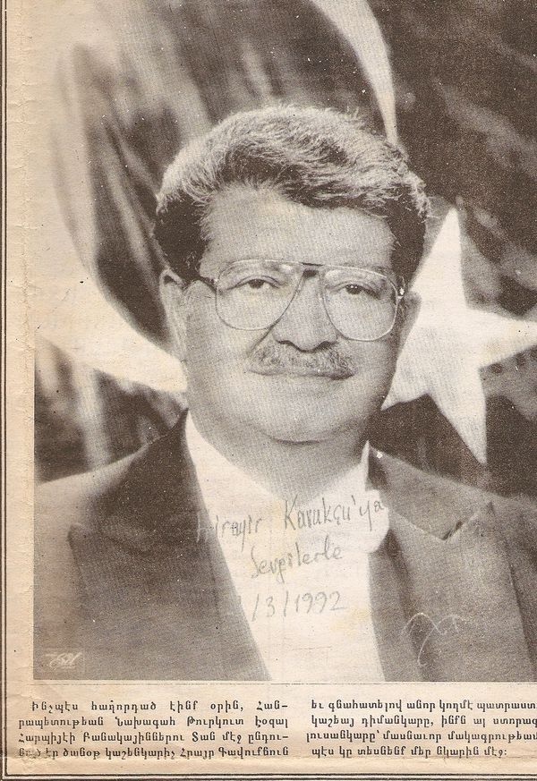 As we reported on the day, the President of the Republic of Turkey, Turgut Özal received the known leather artist Hrayr Kavukcu in the officers' club at Harbiye and appreciated his leather portrait which was prepared by him. He signed his photo as an appreciation sign with a private caption, as we see in our picture.
