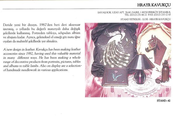 A new design in leather. Kavukcu has been making leather accessories since 1982, having used this valuable material in many different ways. He has been making a whole range of decorative products from portraits, pictures tables, and albums to table lambs. Also on display are a selection of handmade needlework in various applications.