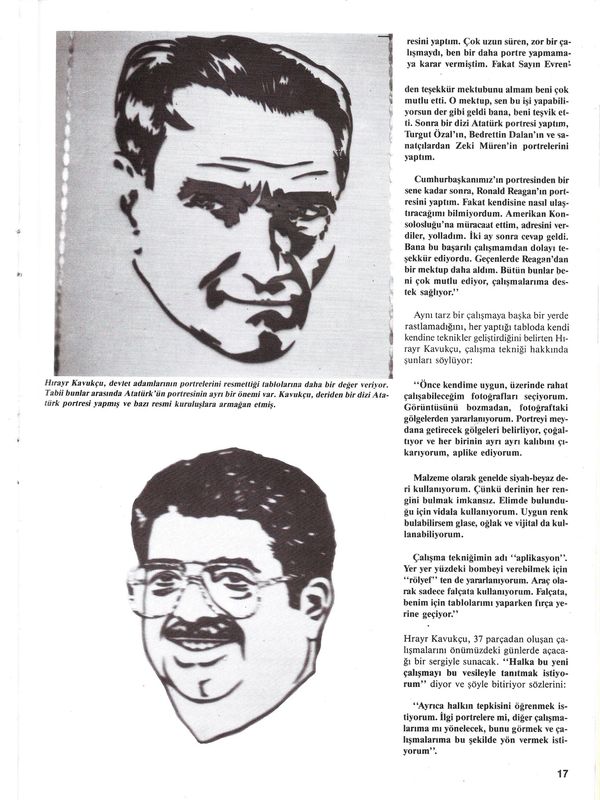 On 16 November 1987, Kavukcu, who sent the portrait of Ragen as a perceptive of friendship, hung the letter of thanks written by President Reagen's hand on his wall. Just above the letter hangs the letter of our president, Kenan Evren. " Now it is time for the portrait of the new US President Bush. It took too much time and effort to make this artwork. Also, sending those artworks to US is highly costly for me. I would be happy If our government could help with this." said Hrayr Kavukcu. States that he believes that such cultural exchanges can strengthen ties between countries.