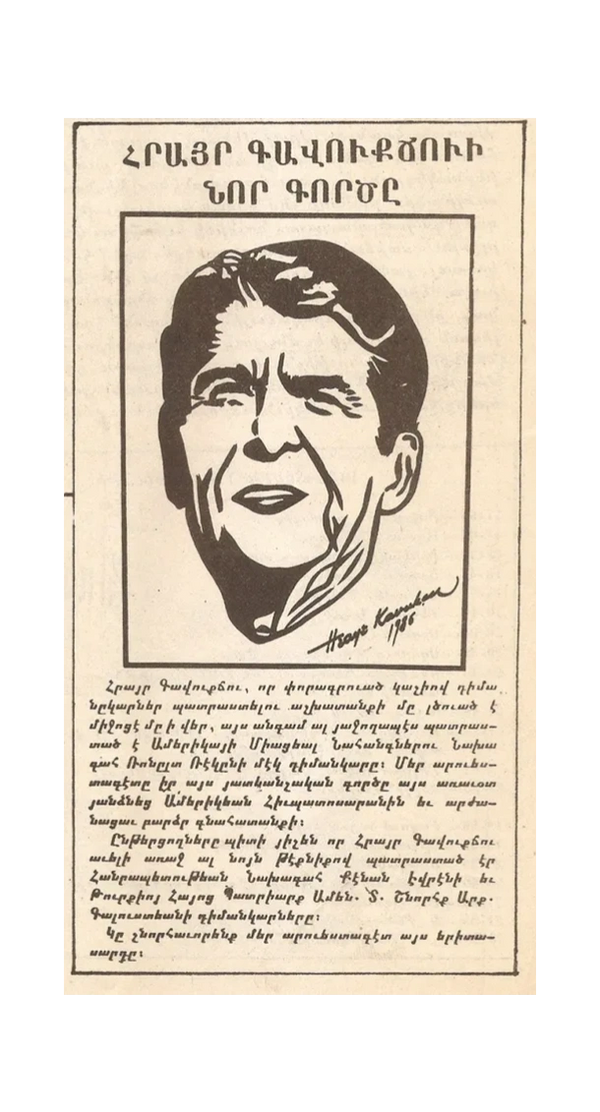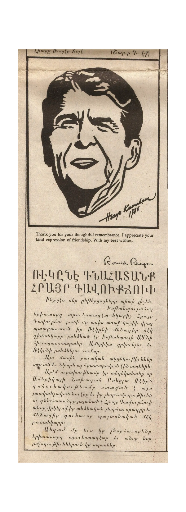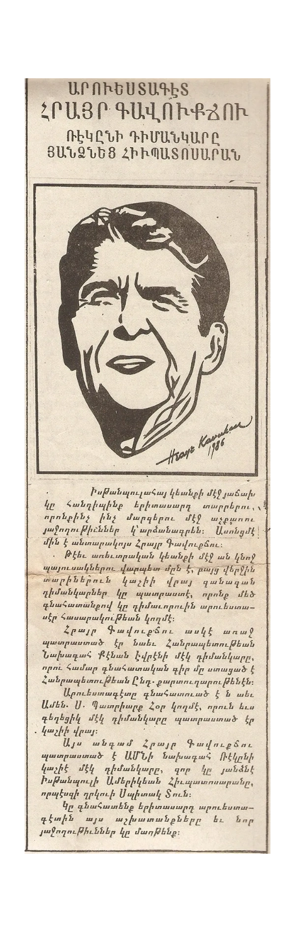 Our readers will remember that Istanbul Armenian young artist and painter Hrayr Kavukcu made the large portrait of Reagan and hand over to the Istanbul US Ambbasy to send it to Reagan. About this, they got enough information, and at the time, they published the picture of the portrait.