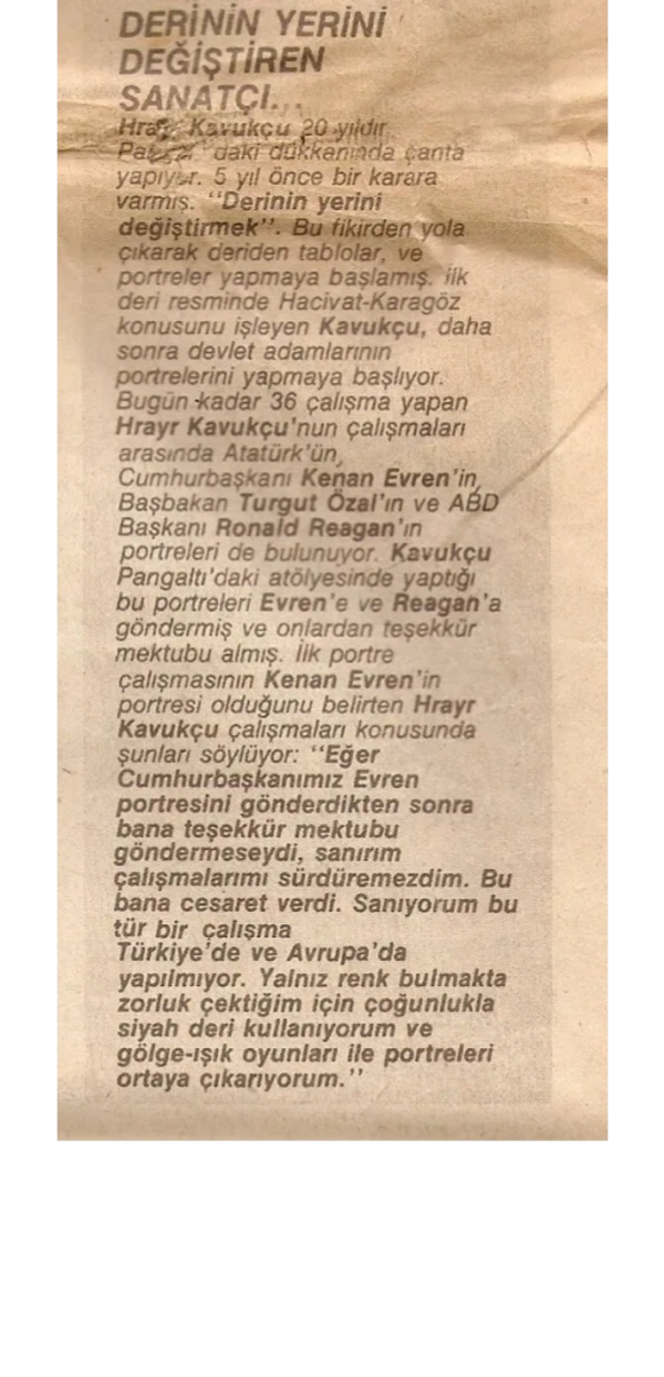 Upcoming this idea, he begins to make tables and portraits from leather. In his first leather artwork, Kavukcu dealt with the theme of Hacivat-Karagöz. Later on, he started to make portraits of statesmen. Among the works of Hrayr Kavukcu, who has created 36 artworks so far, there are portraits of Atatürk, head of state Kenan Evren, president Turgut Özal and Us president Ronald Reagen. He sent these portraits to Evren and Reagan, which he made in his workshop at Pangaltı, and he received appreciation letters from them. Hrayr Kavukcu stated that his first portrait work was the portrait of Kenan Evren and said the following about his work: "If our president Evren had not sent the letter of thanks after sending the portrait, I think I could not continue my work. It gave me courage. I think in Turkey and Europe there is no work such as this. Because I am having trouble finding colors, I usually use black leather and chiaroscuro to reveal portraits.